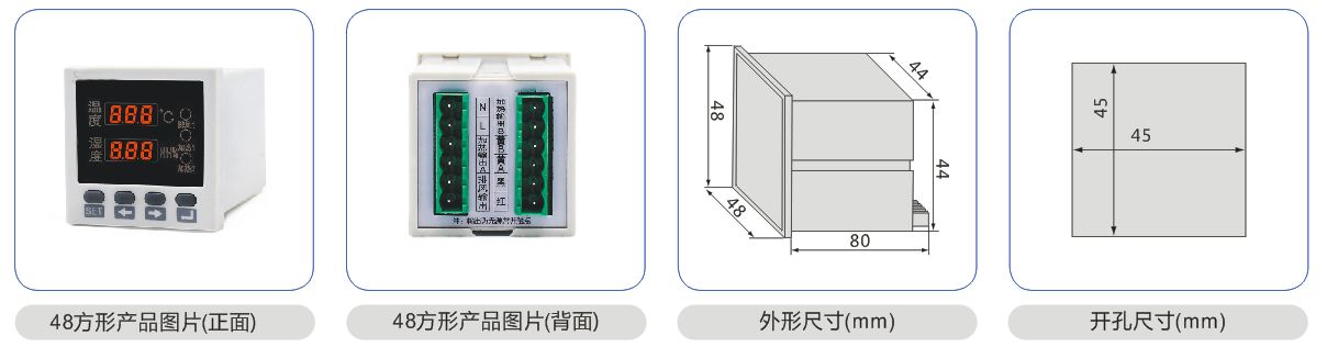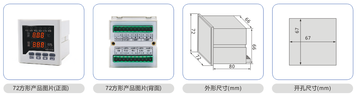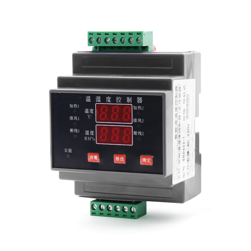 智能型溫濕度控制器采用數(shù)字溫濕度傳感器,以數(shù)碼管LED方式顯示溫度、溫度值,帶有風(fēng)扇、加熱器接點(diǎn),并有加熱器斷線報(bào)警、傳感器故障指示等功能。產(chǎn)品還可帶有RS485通訊接口或報(bào)警開關(guān)量輸出,用于實(shí)現(xiàn)環(huán)境溫、濕度值及工作狀態(tài)參數(shù)向上位機(jī)遠(yuǎn)傳,適合無(wú)人值守變電所要求。用戶可通過按鍵編程任意設(shè)定溫度、濕度的上下限,循環(huán)顯示方式,通訊參數(shù)等。