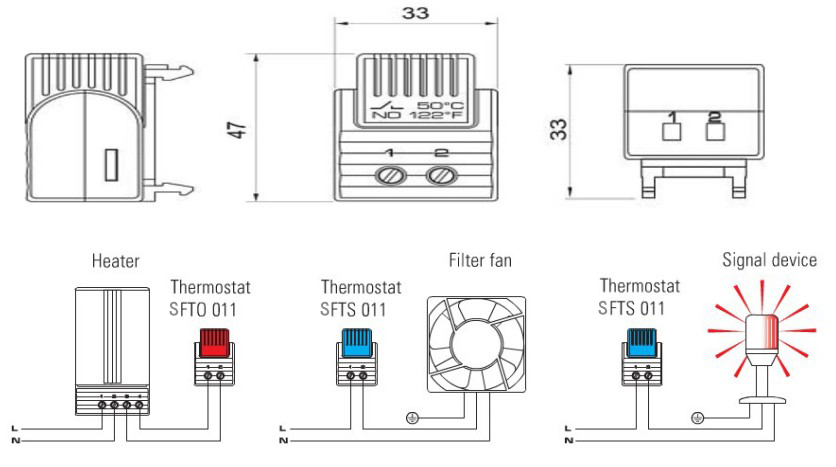 防篡改(預(yù)設(shè))恒溫器SFTO 011:當(dāng)溫度降至低值以下時,用于在溫度低于小值時調(diào)節(jié)加熱器或開關(guān)信號裝置的觸點(diǎn)斷路器/NC(紅色外殼)。當(dāng)溫度升高時,觸點(diǎn)打開。