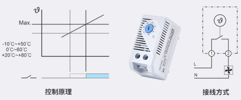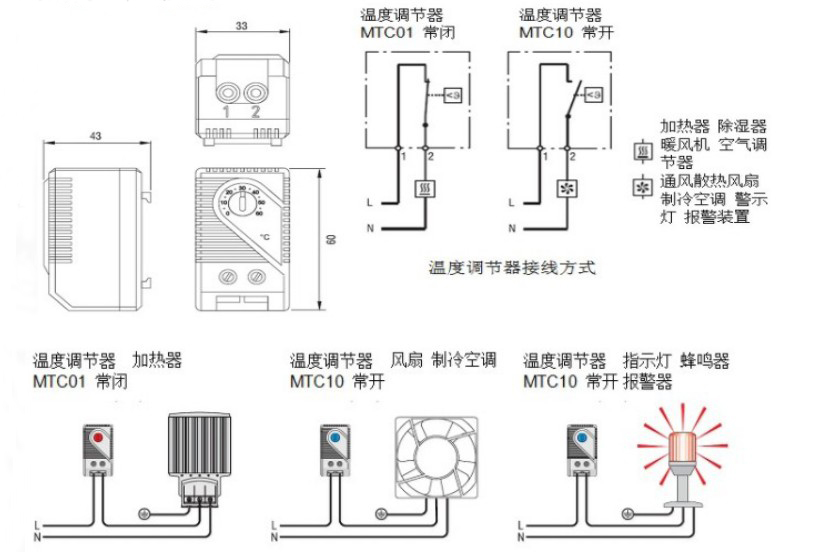 MTC 01 瞬動常閉觸點(diǎn)(SPST-NC 設(shè)定旋鈕紅色表示)適用于加熱、除濕控制。