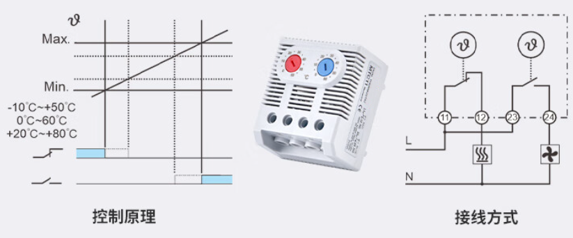單個(gè)機(jī)殼內(nèi)集成了兩個(gè)獨(dú)立的溫控開(kāi)關(guān)單元,左側(cè)瞬動(dòng)常閉觸點(diǎn)(SPST-NC設(shè)定旋鈕紅色表示)用于加熱,除濕控制,右側(cè)瞬動(dòng)常開(kāi)觸點(diǎn)(SPST-NO設(shè)定旋鈕藍(lán)色表示)用于風(fēng)扇過(guò)濾網(wǎng)組散熱冷卻設(shè)備,警示燈,警報(bào)信號(hào)。