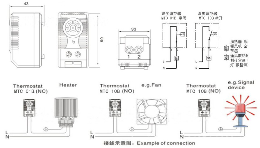 MTC 01B 瞬動常閉觸點(diǎn)(SPST-NC 設(shè)定旋鈕紅色表示)適用于加熱、除濕控制。